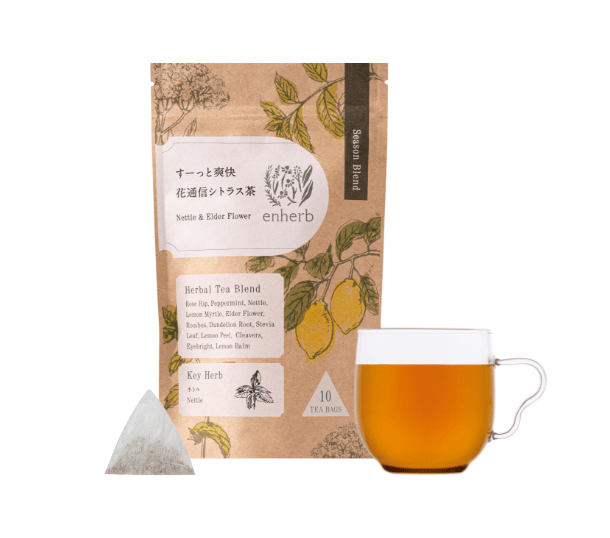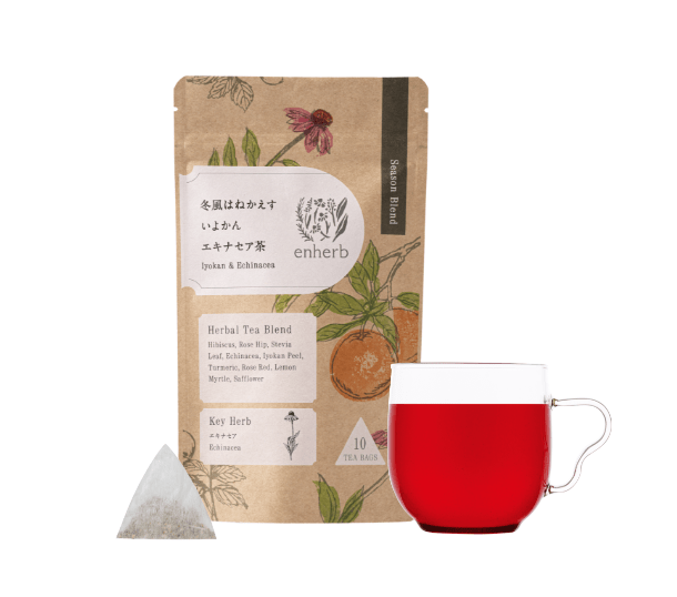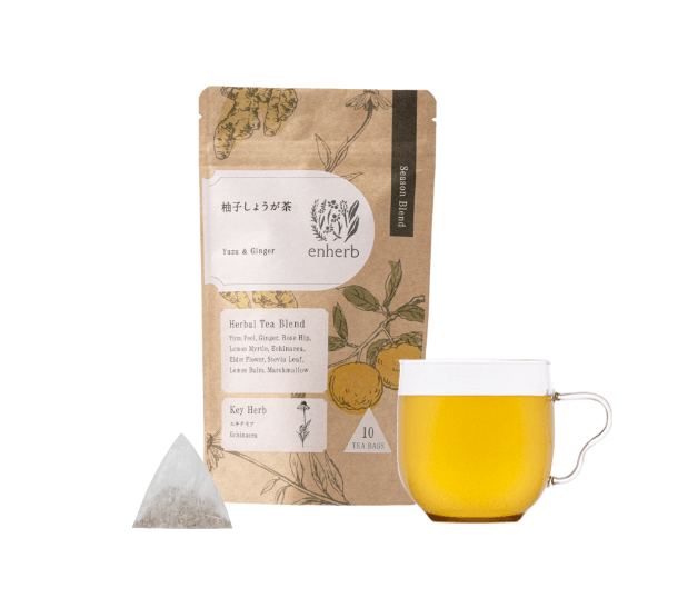 エンハーブの季節限定茶人気No.1*。香り高い柚子をはじめ、ぽかぽか温まるしょうがや、元気な毎日のお守りのエキナセアなど、9種をブレンド。*当社季節限定ハーブティー売上調べ(2024年度)