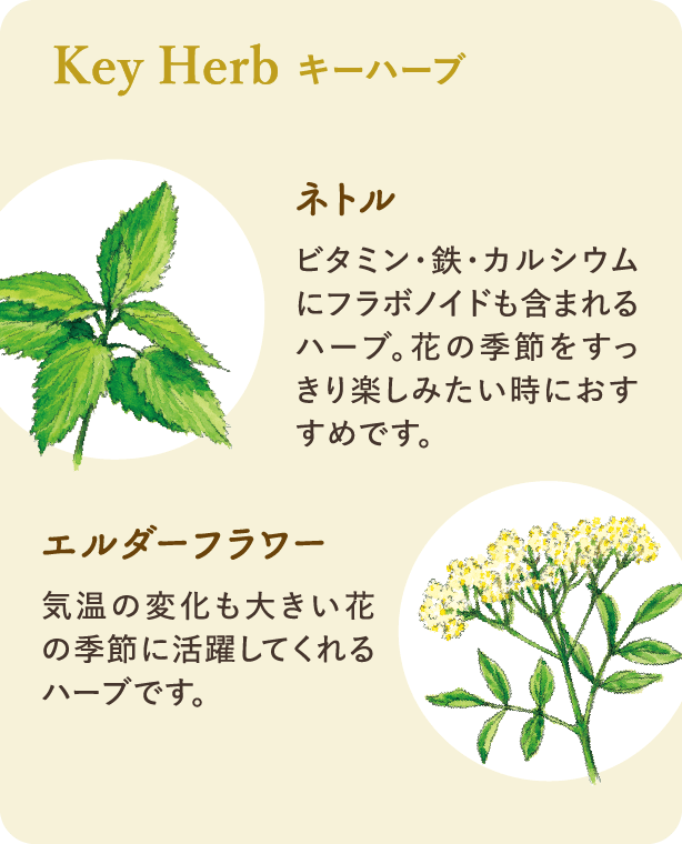 エルダーフラワー、ネトル、爽快なペパーミントを、